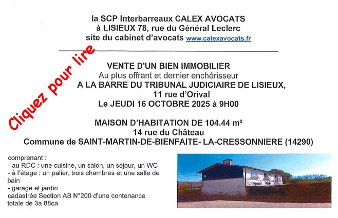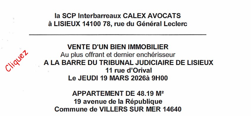 - vous pouvez visiter l’immeuble dans le cadre des modalités définies par l’avocat mettant en vente l’immeuble et consulter le cas échéant le cahier des conditions de vente (contenant notamment l’origine de propriété, les diagnostics, …) auprès du greffe du Tribunal de Grande Instance de LISIEUX ou de l’avocat en charge de la vente.